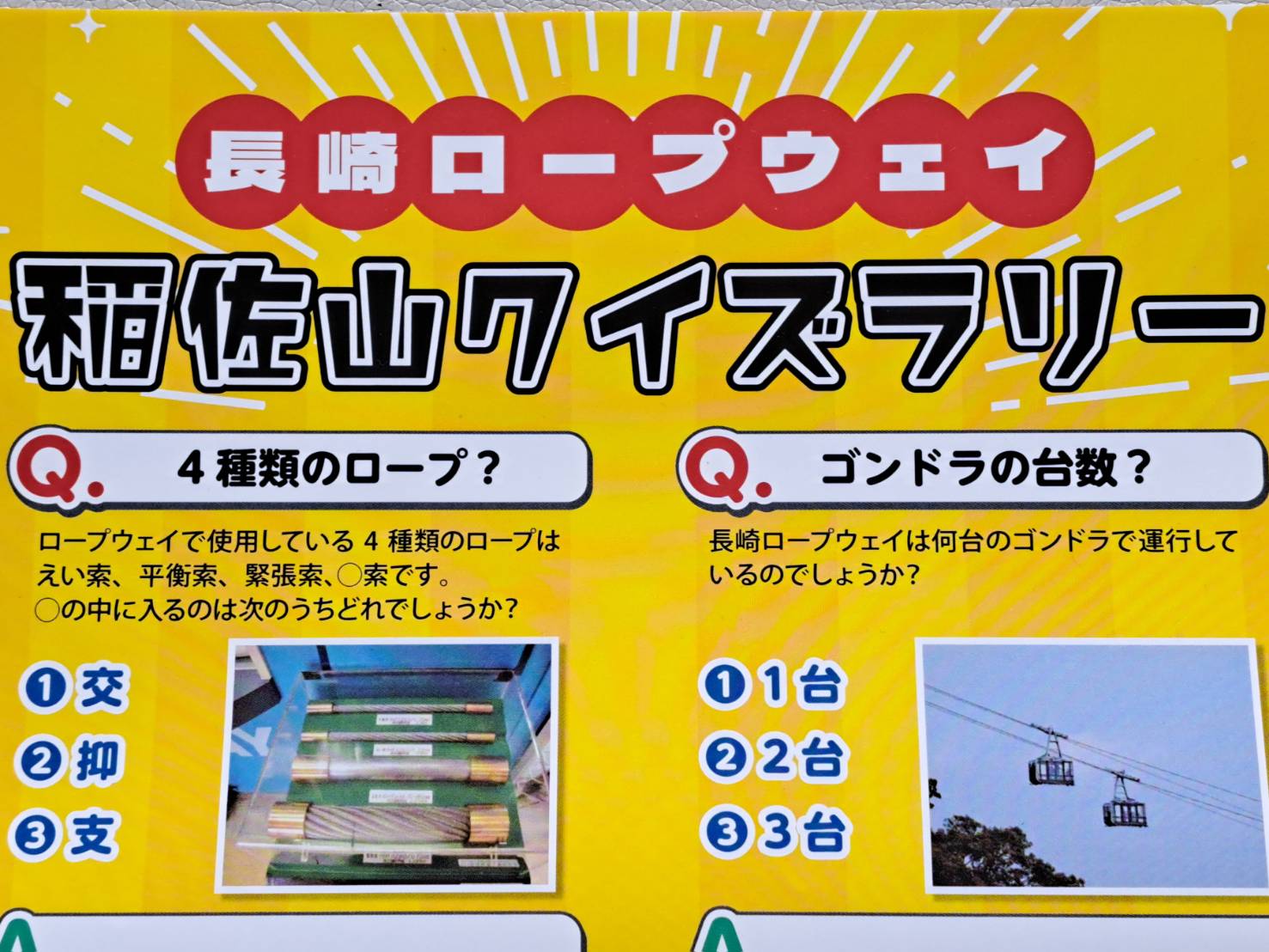 クイズラリー開催中 長崎ロープウェイ 2026年4月27日 イベント 🚠ロープウェイ🚠ご利用のお客様を対象に『クイズラリー』🧐を開催しております。 期 間 令和8年4月25日(土)〜令和8年5月6日(水) クイズに全問正解された方の中から、抽選で10名様に『長崎ロープウェイオリジナルグッズ詰め合わせ』をプレゼントいたします。(※抽選は、期間終了後となります。参加費は無料です。) カテゴリー: イベント, お知らせ, 長崎ロープウェイ 投稿ナビゲーション 前 前の投稿: 稲佐山公園つつじまつり2026次 次の投稿: こどもの日プレゼント企画🎏 関連投稿 こどもの日プレゼント企画🎏 2026年4月27日 稲佐山公園つつじまつり2026 2026年4月21日 スロープカーの運休について 2026年4月14日